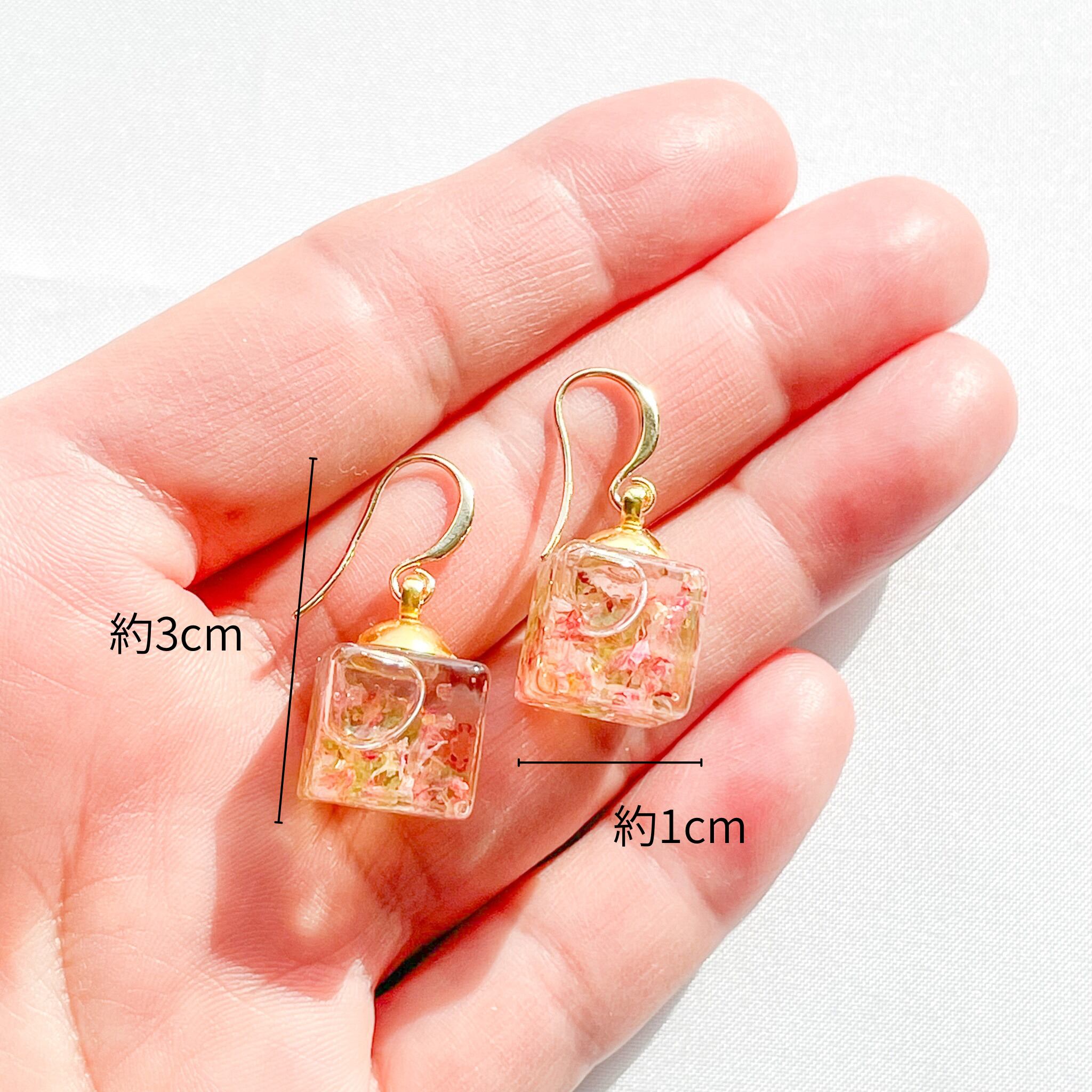 【送料無料】ペリドットと春色花びらのガラスドームピアス/イヤリング ゴールド キューブ ハーバリウム 金属アレルギー対応