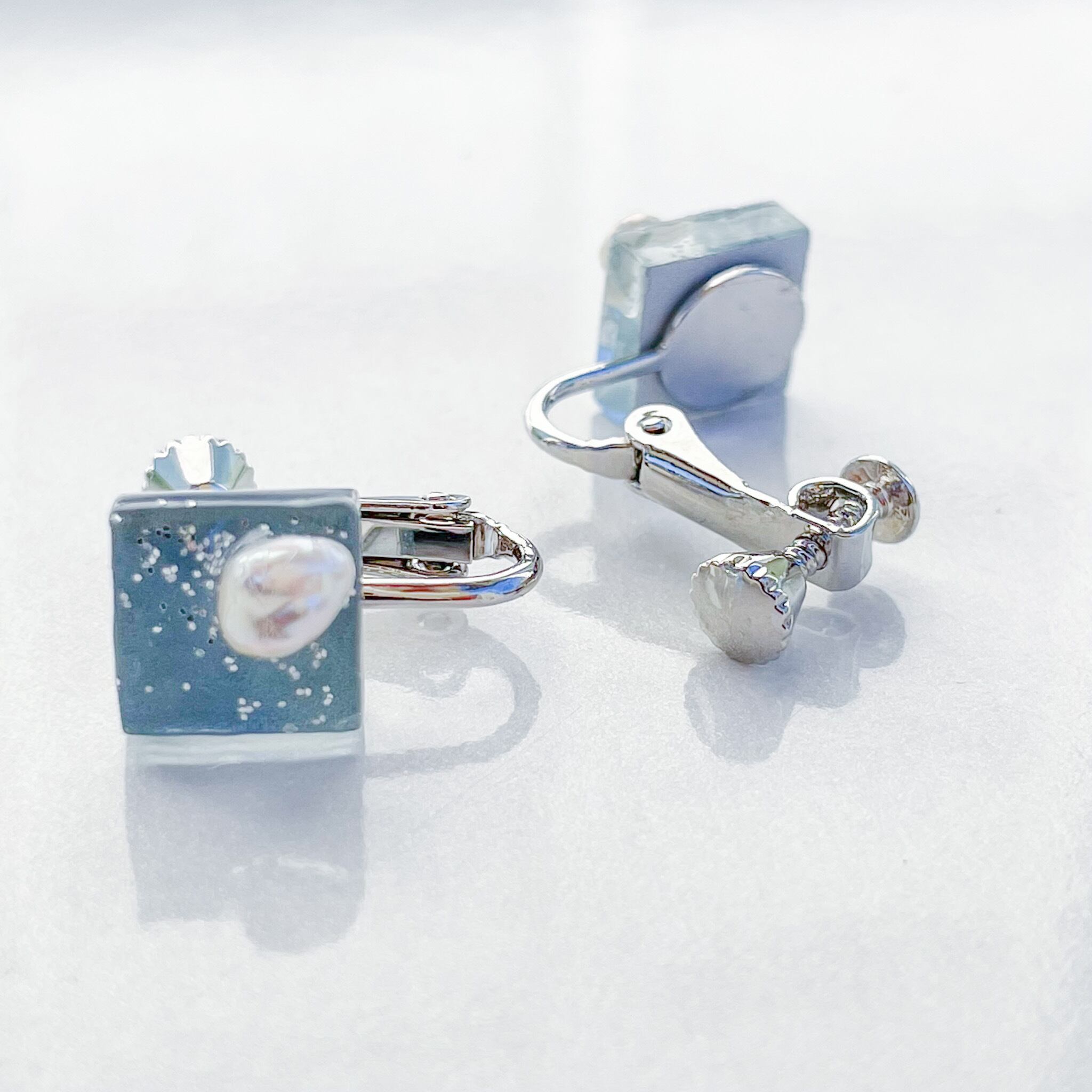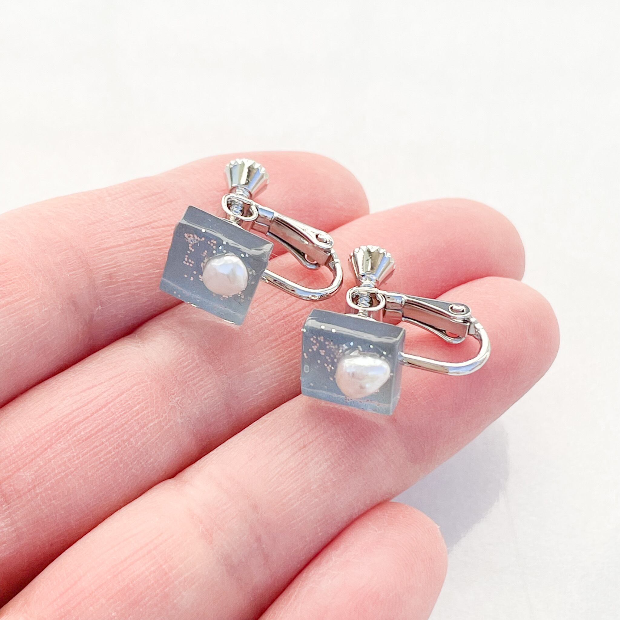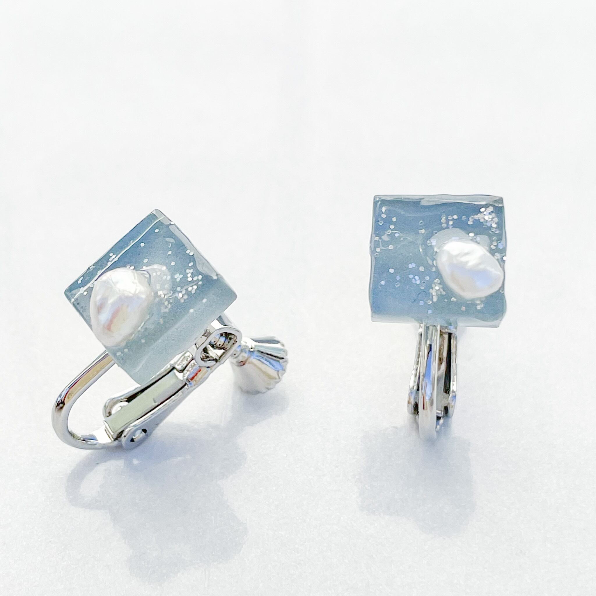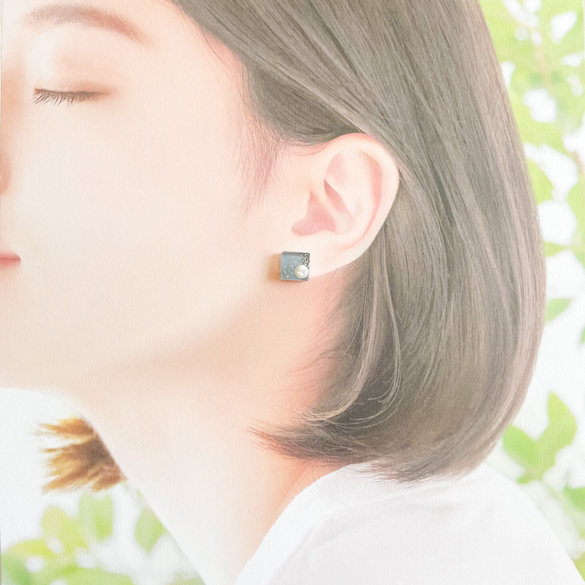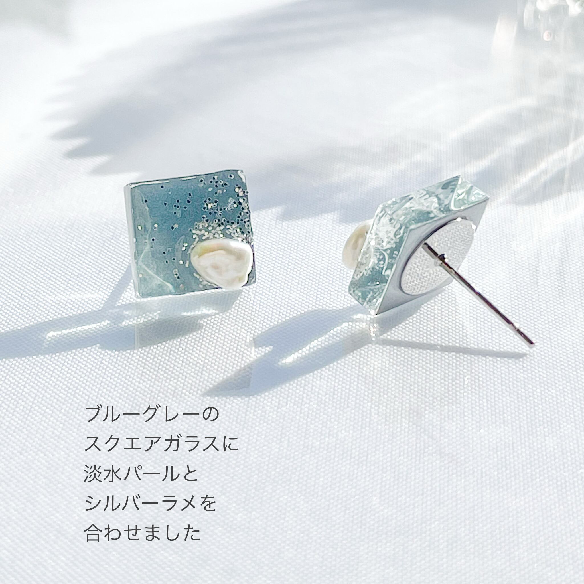 【送料無料】ガラスピアス/イヤリング ブルーグレー 淡水パール スクエア 軽い 金属アレルギー対応 シルバー