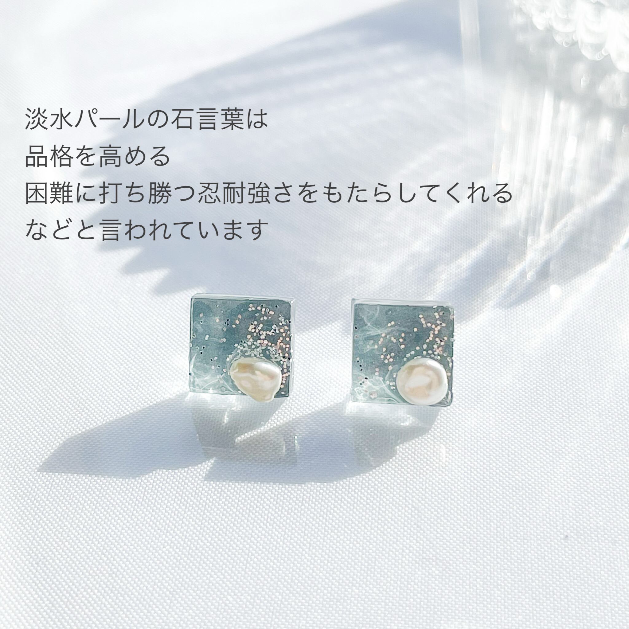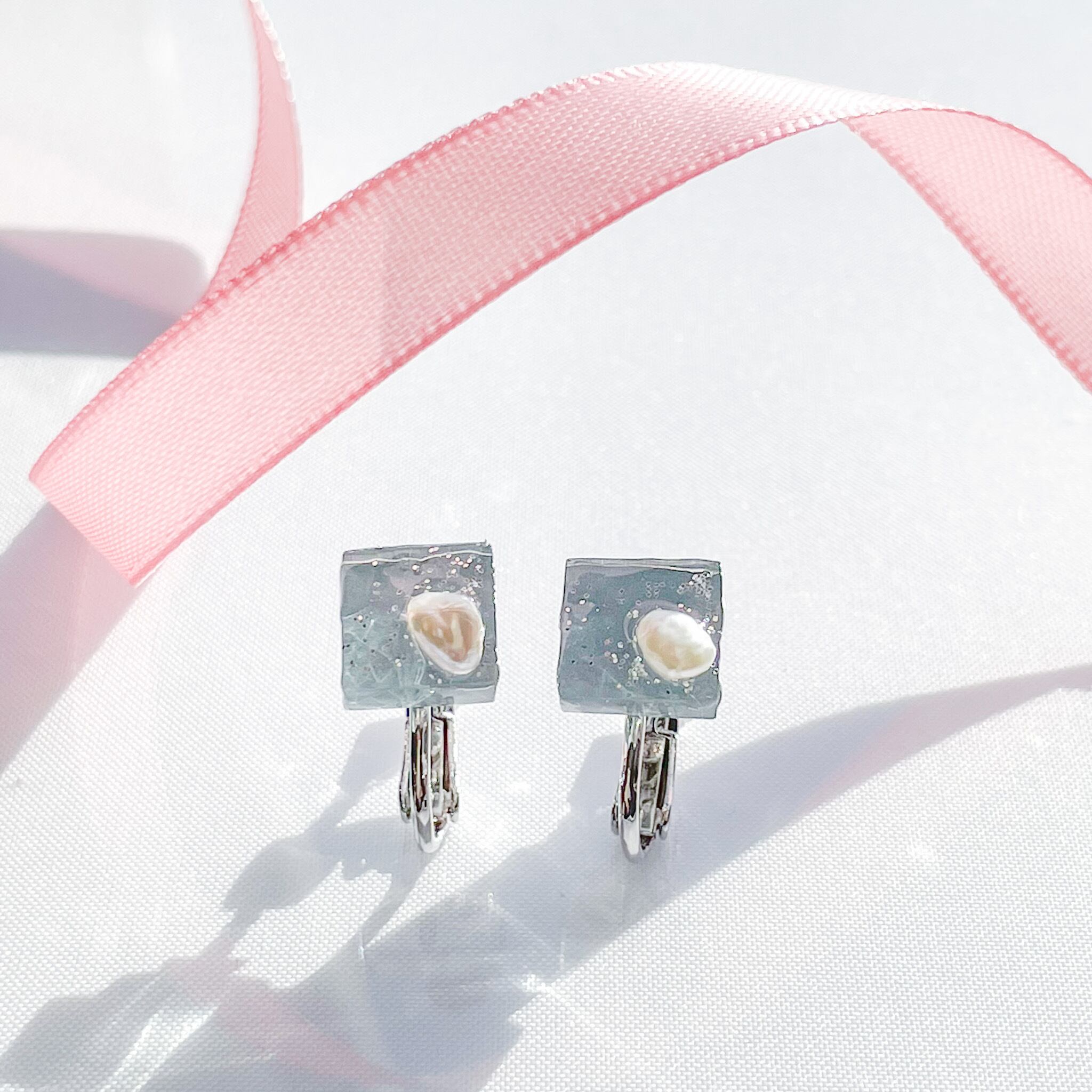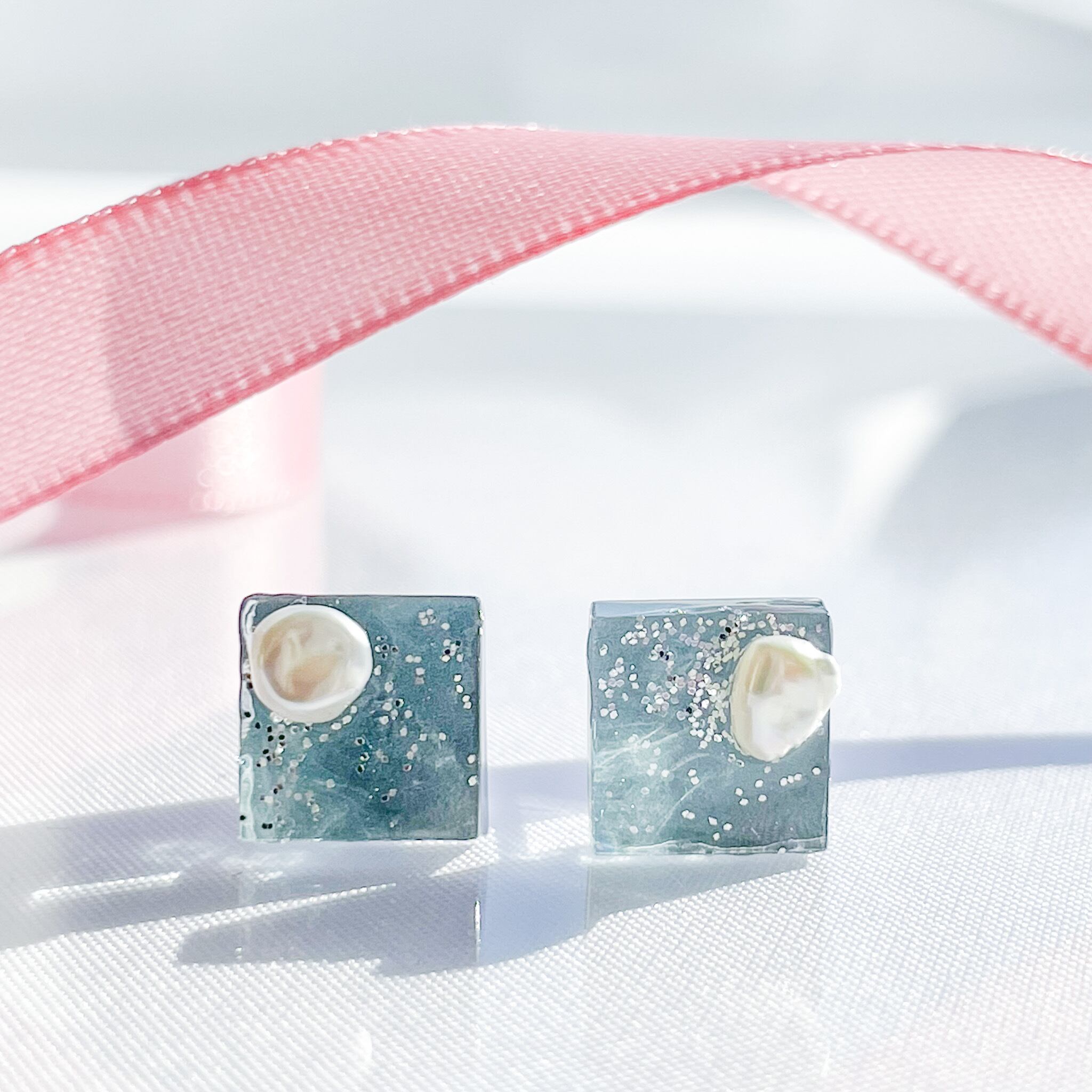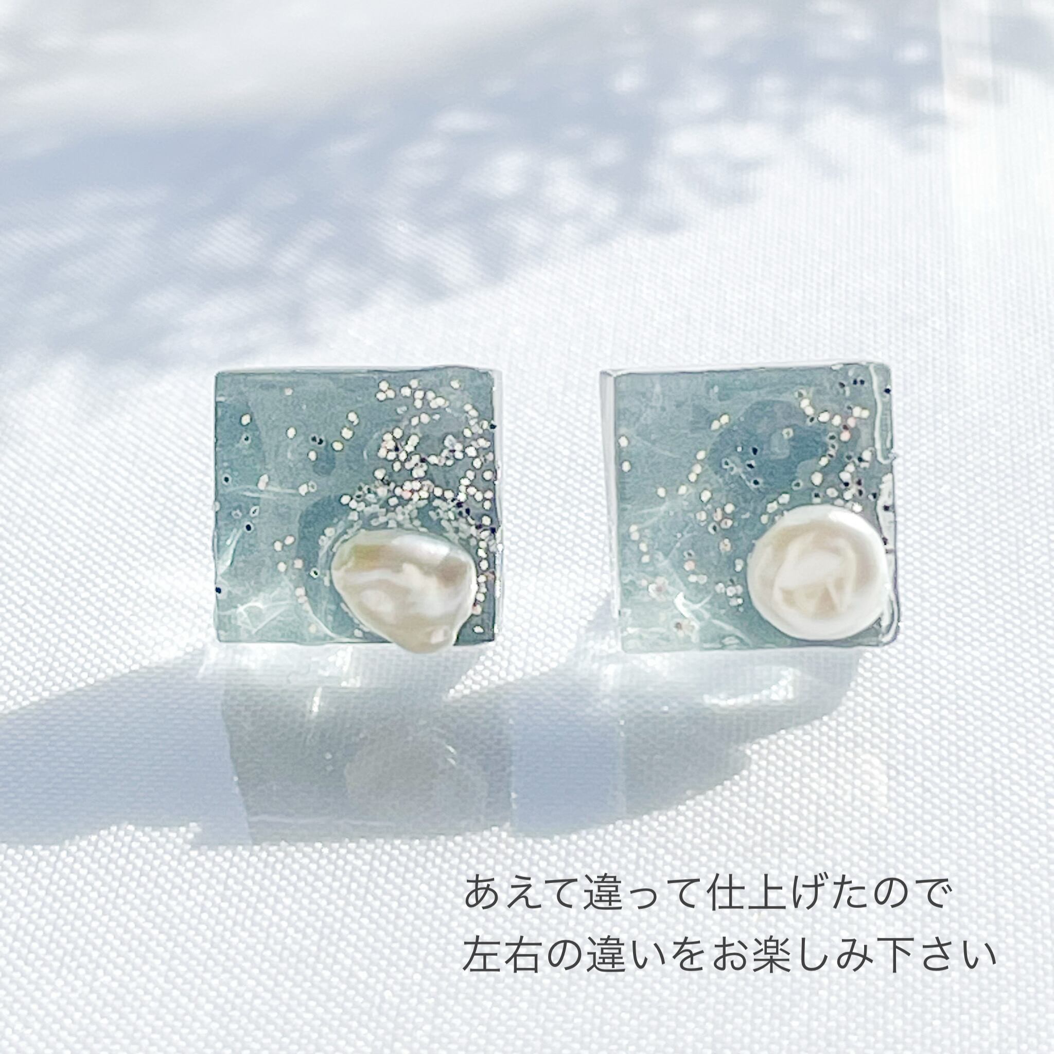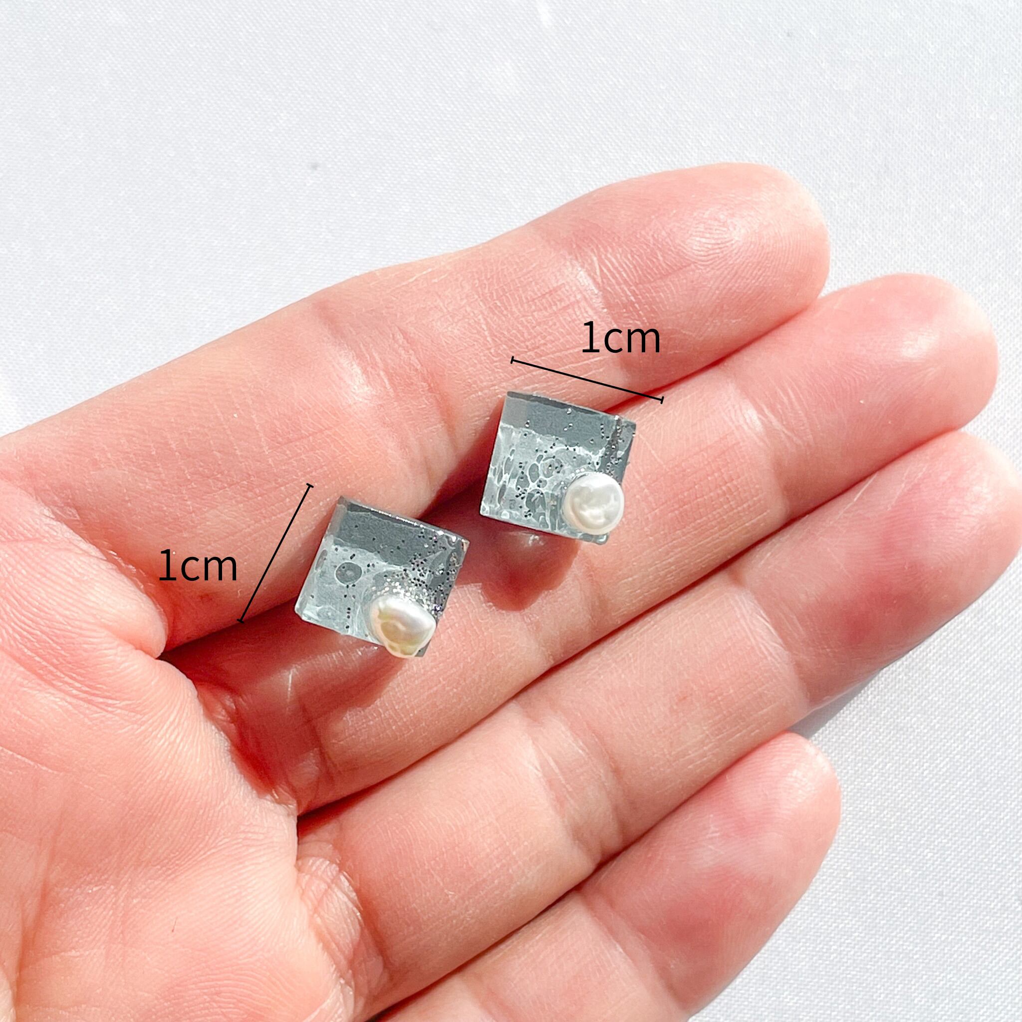 【送料無料】ガラスピアス/イヤリング ブルーグレー 淡水パール スクエア 軽い 金属アレルギー対応 シルバー
