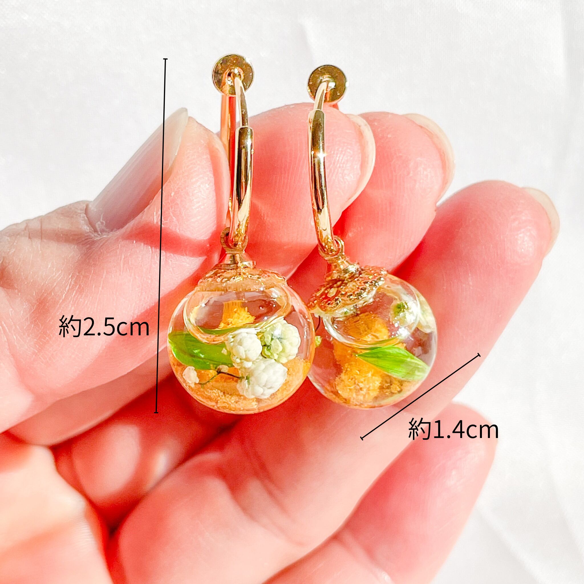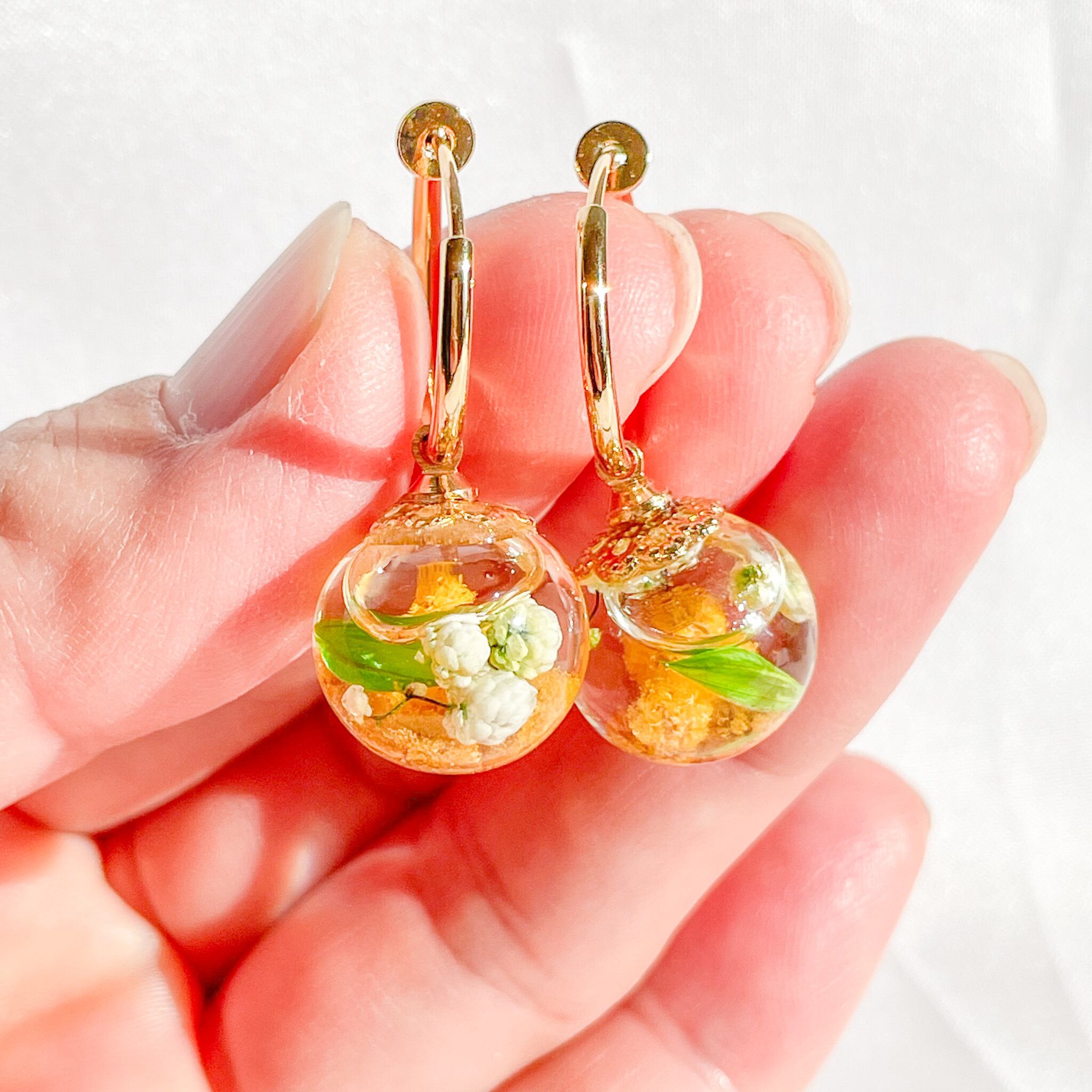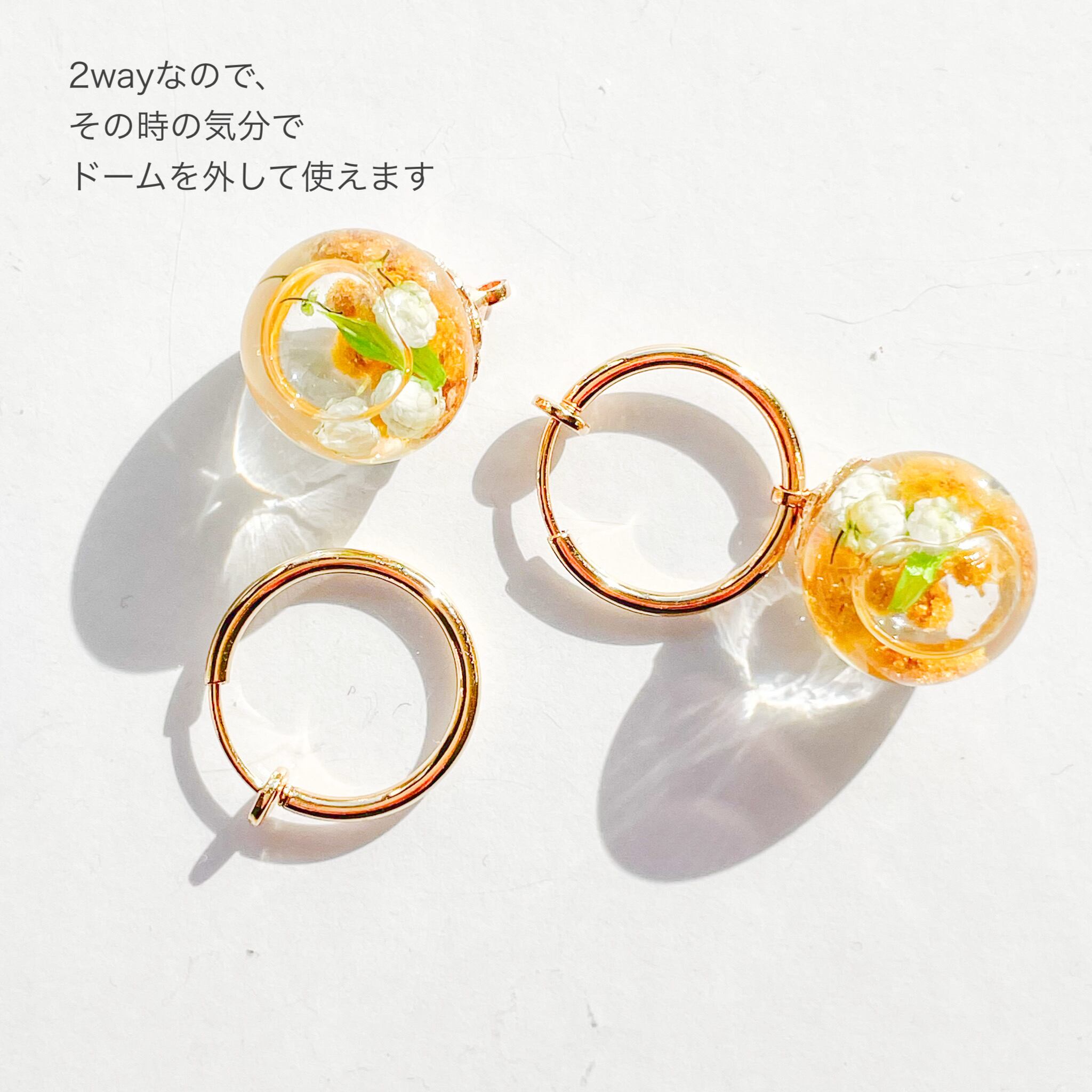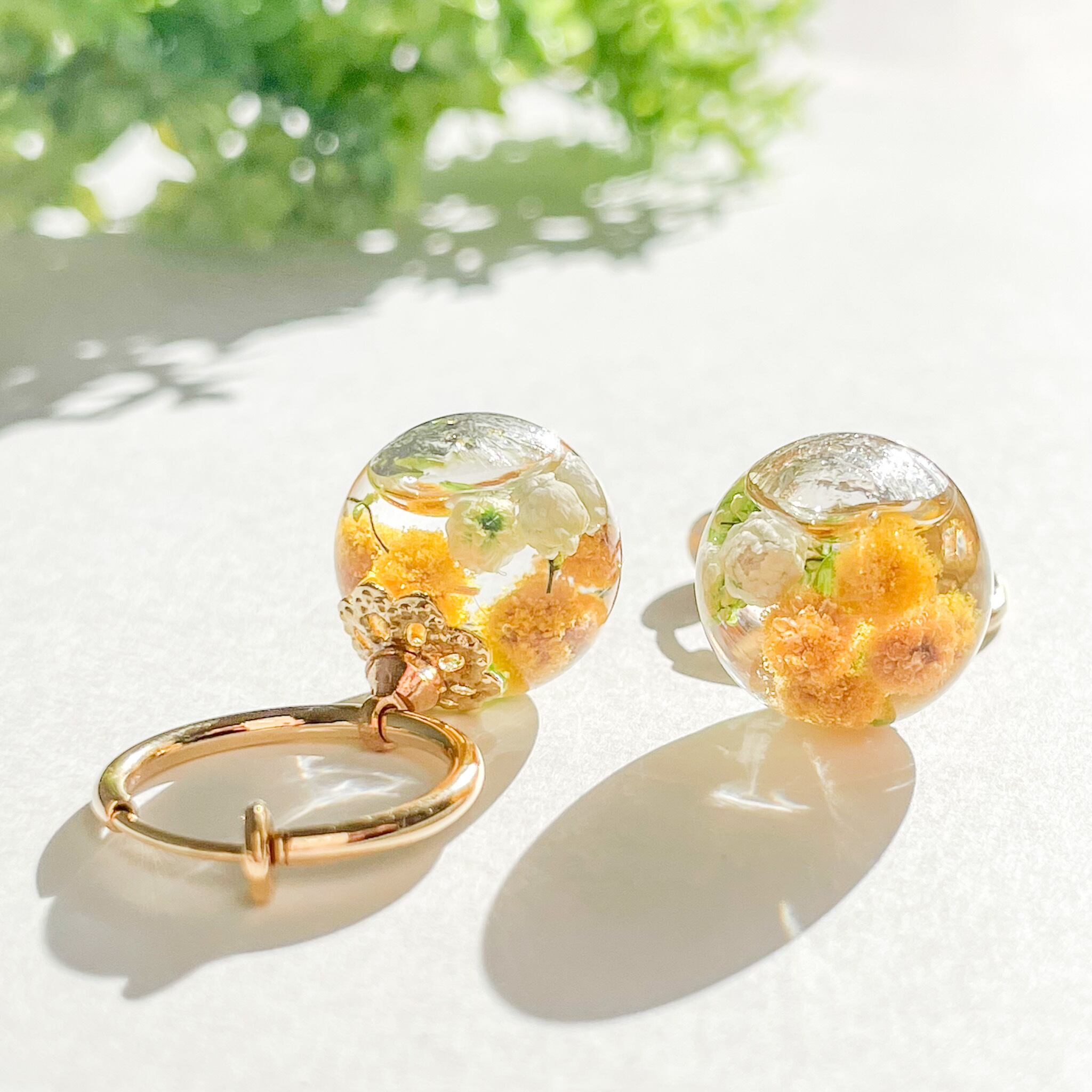 ミモザのフープイヤリング ガラスドーム ドライフラワー キラキラ 揺れる 2way ご褒美 ギフト 軽い 金属アレ対応