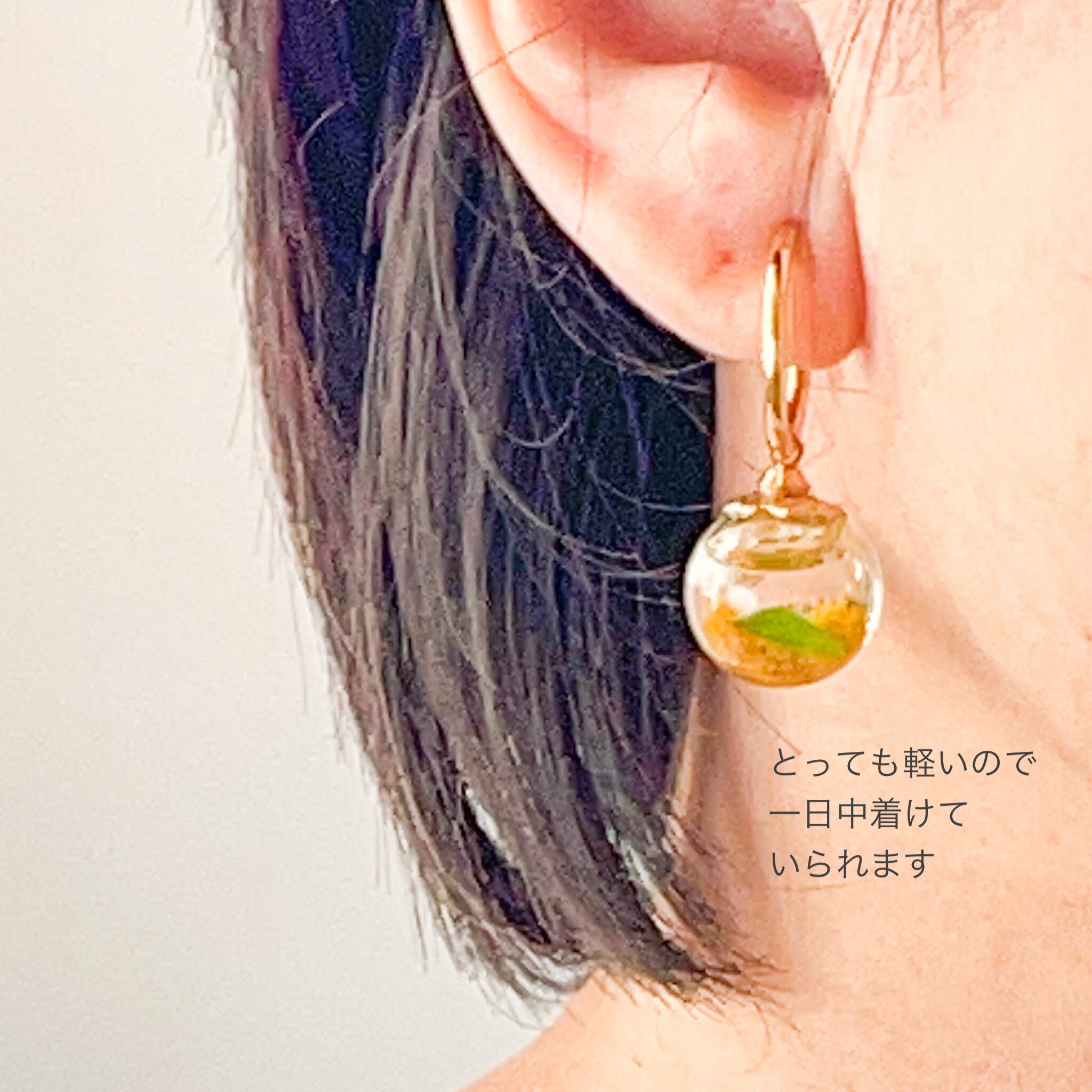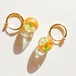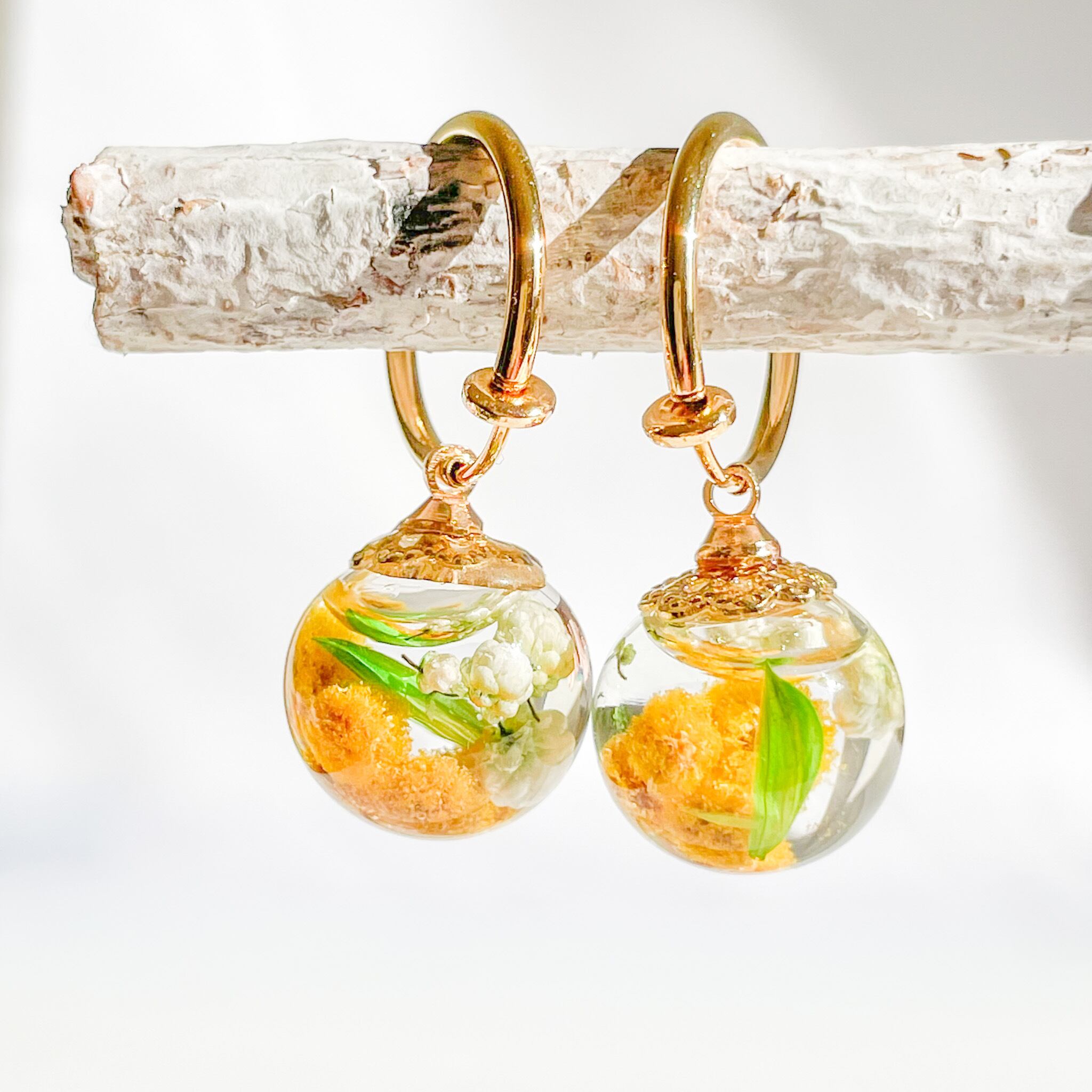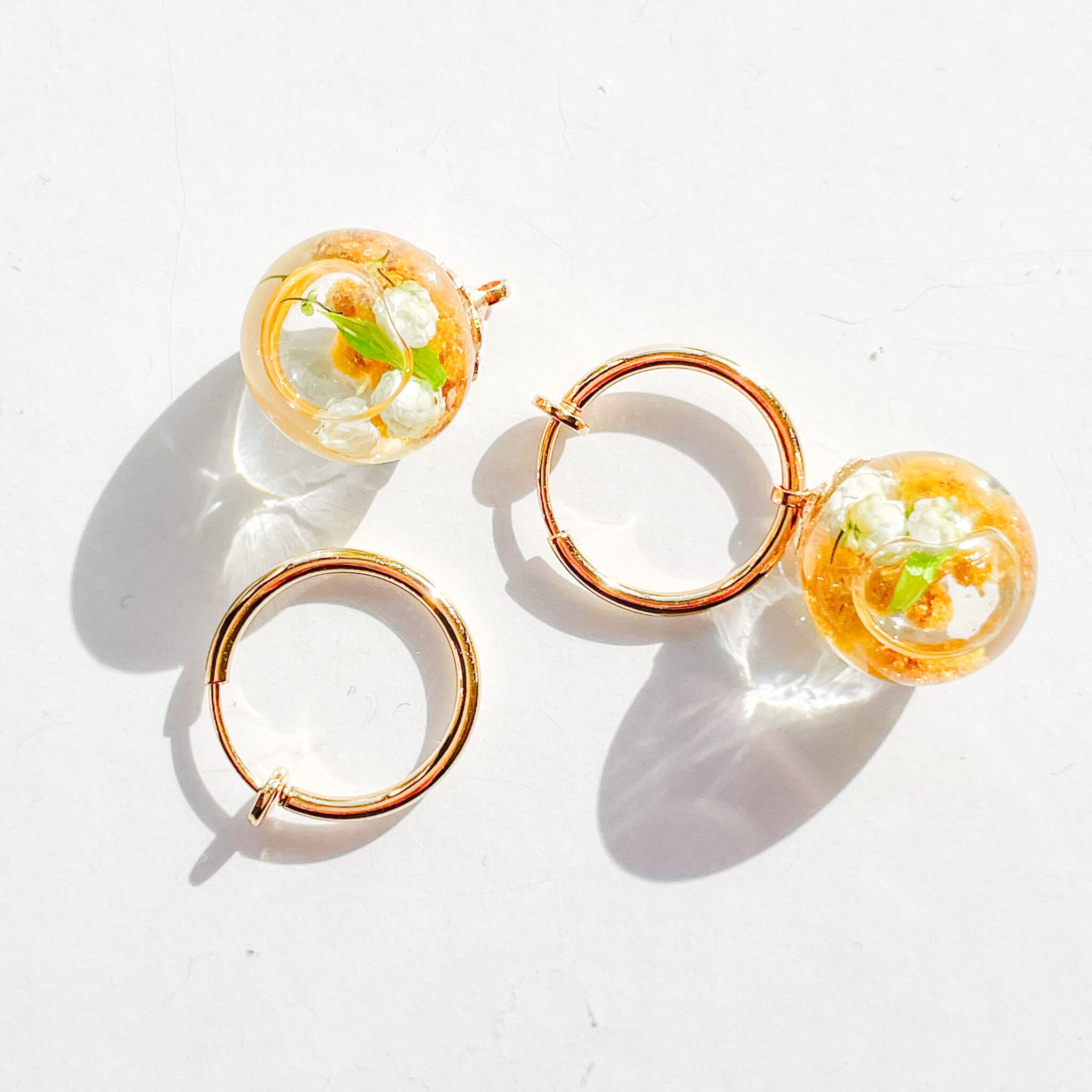 ミモザのフープイヤリング ガラスドーム ドライフラワー キラキラ 揺れる 2way ご褒美 ギフト 軽い 金属アレ対応