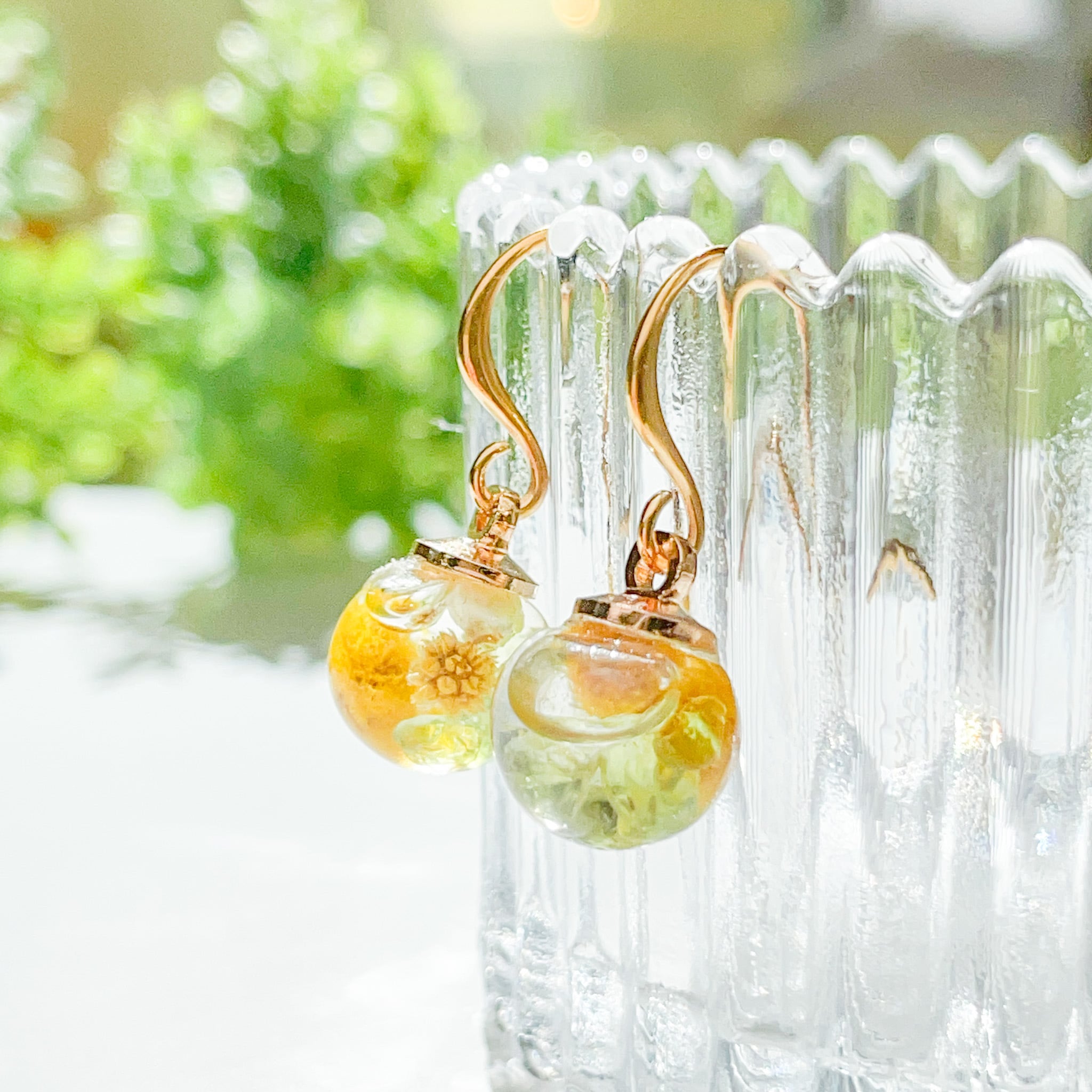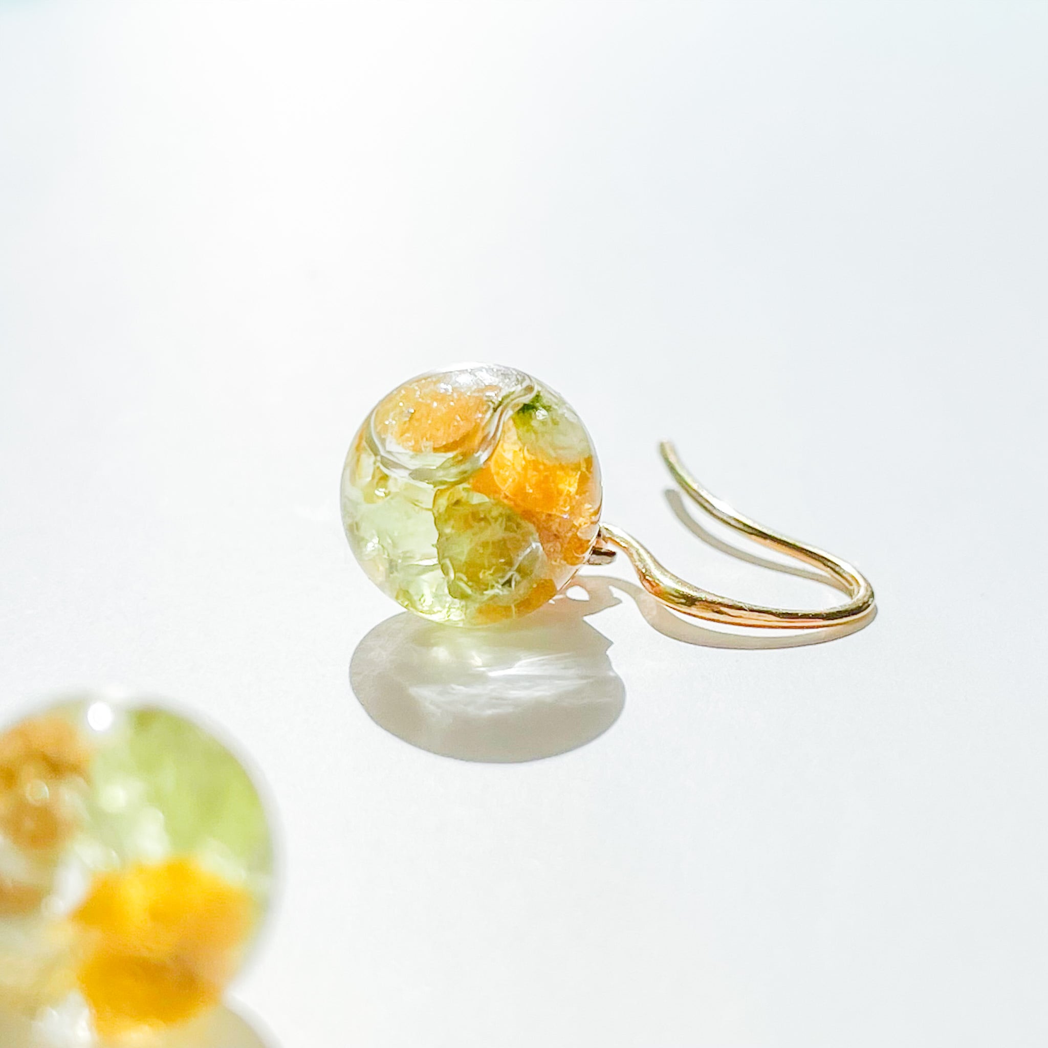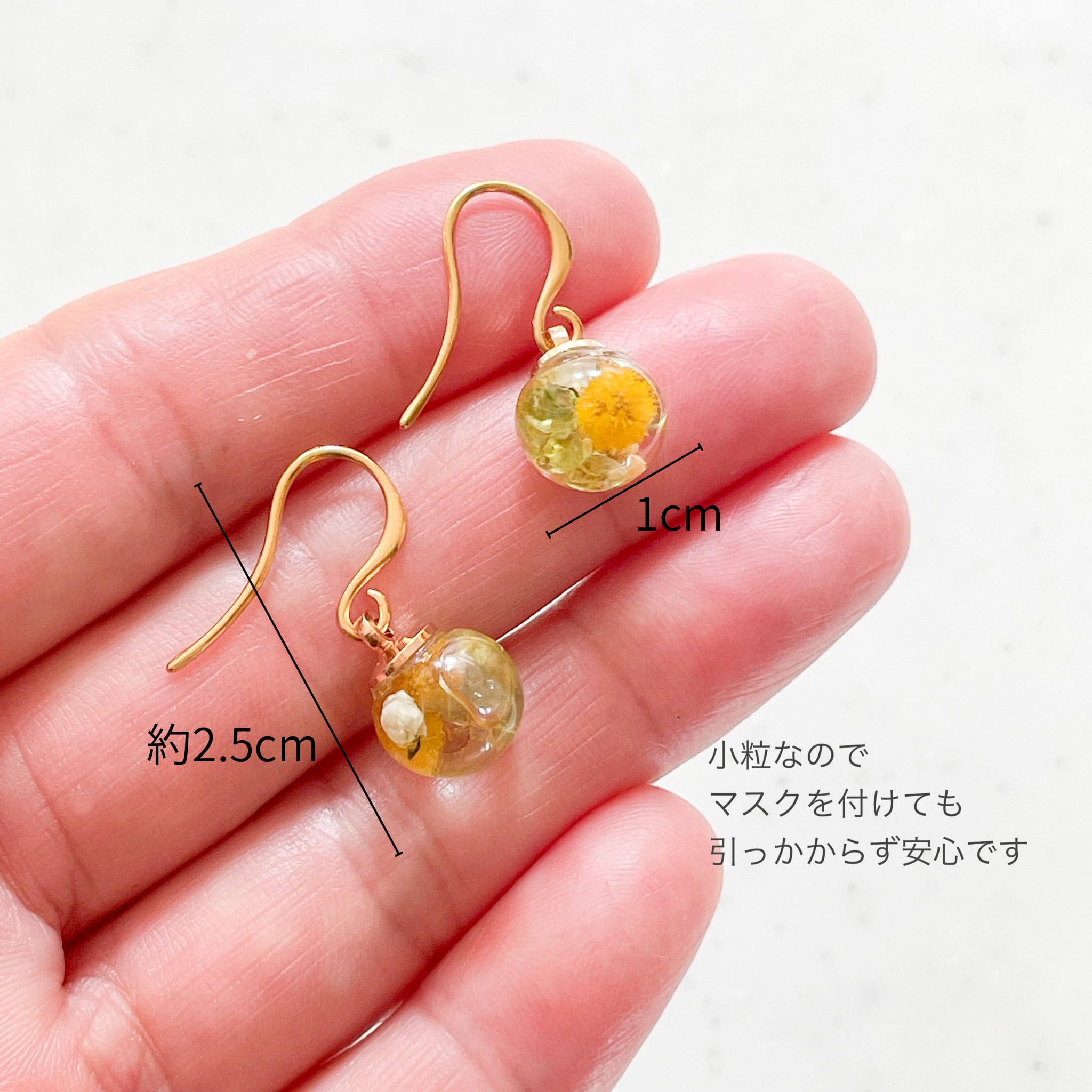 ミモザとペリドットのガラスドームピアス 軽い 揺れる 小粒 小さい キラキラ 春ピアス 金属アレルギー対応 ゴールド