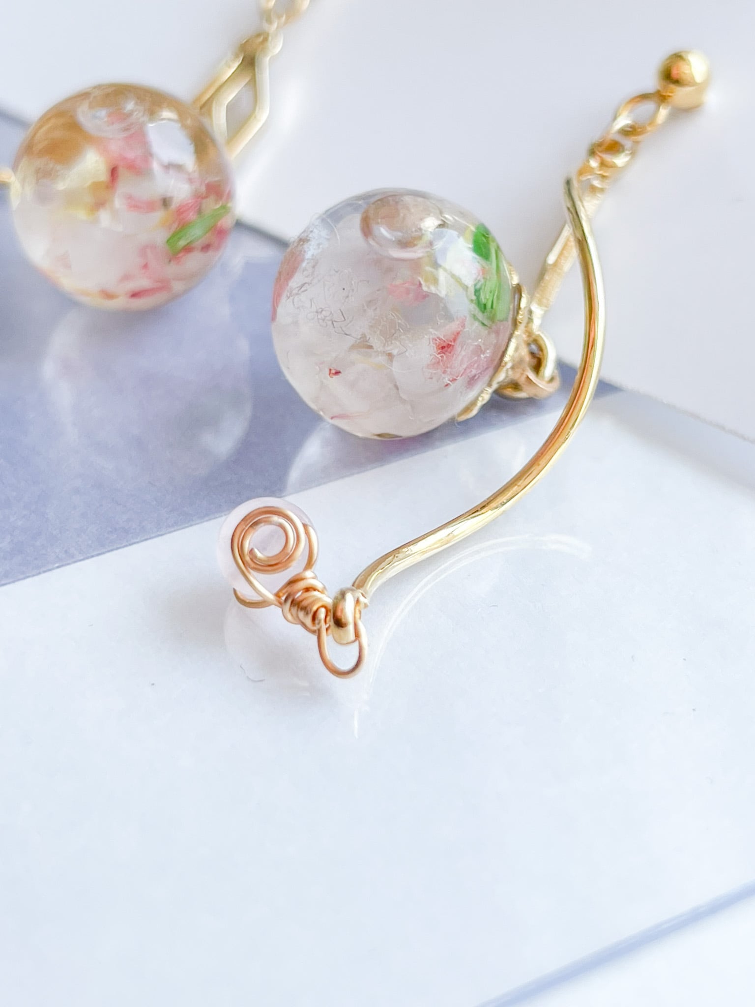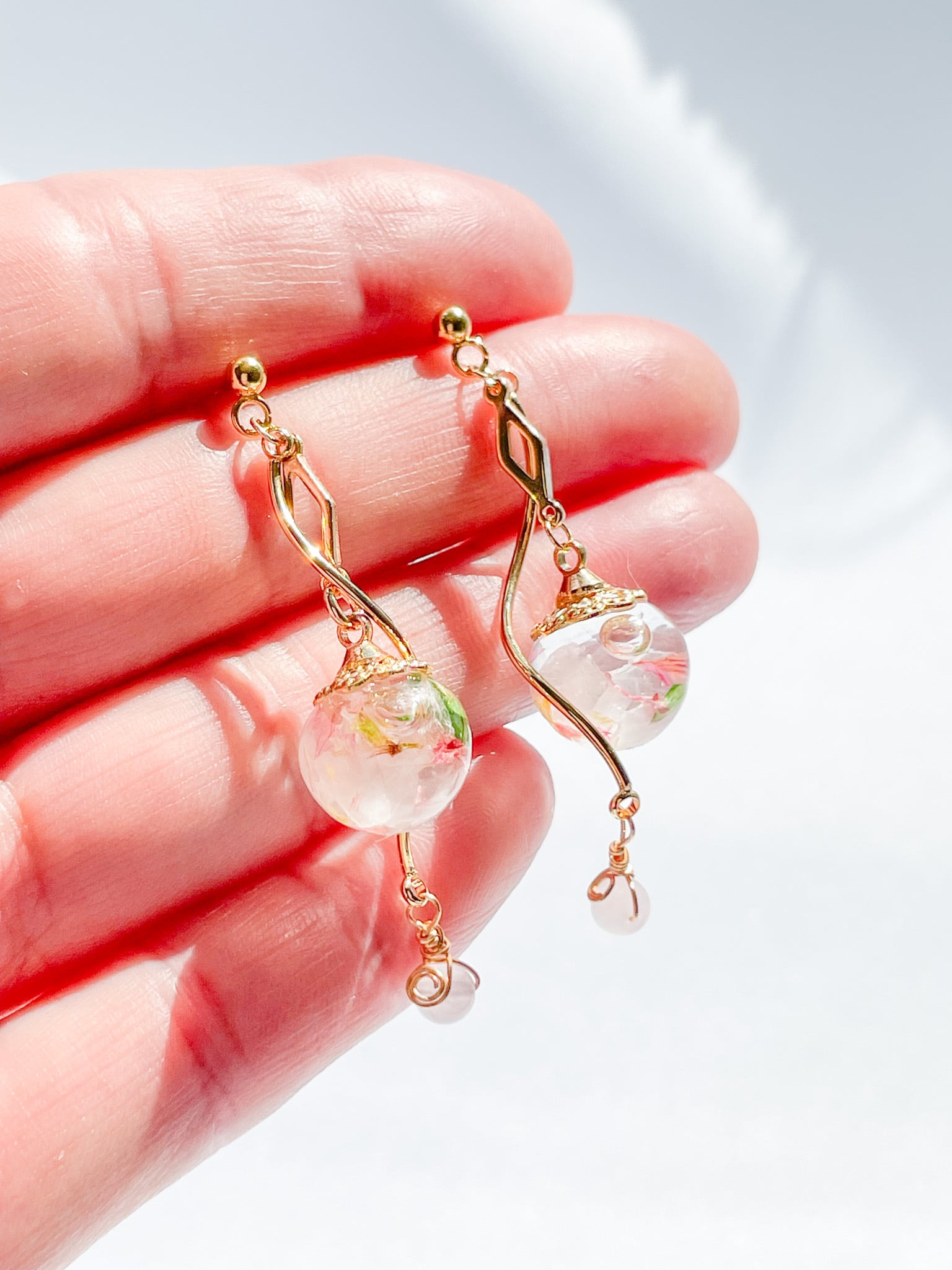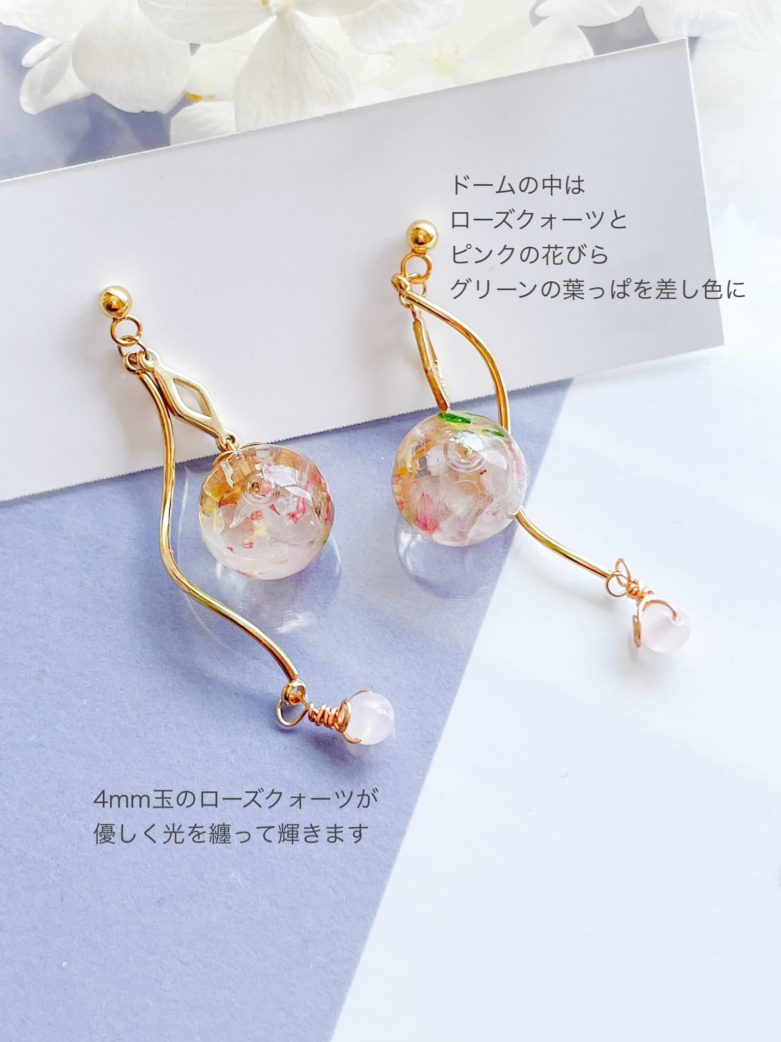 ローズクオーツと花びらのガラスドームピアス/イヤリング 揺れる ロング 軽い キラキラ ご褒美 ギフト金属アレルギー対応