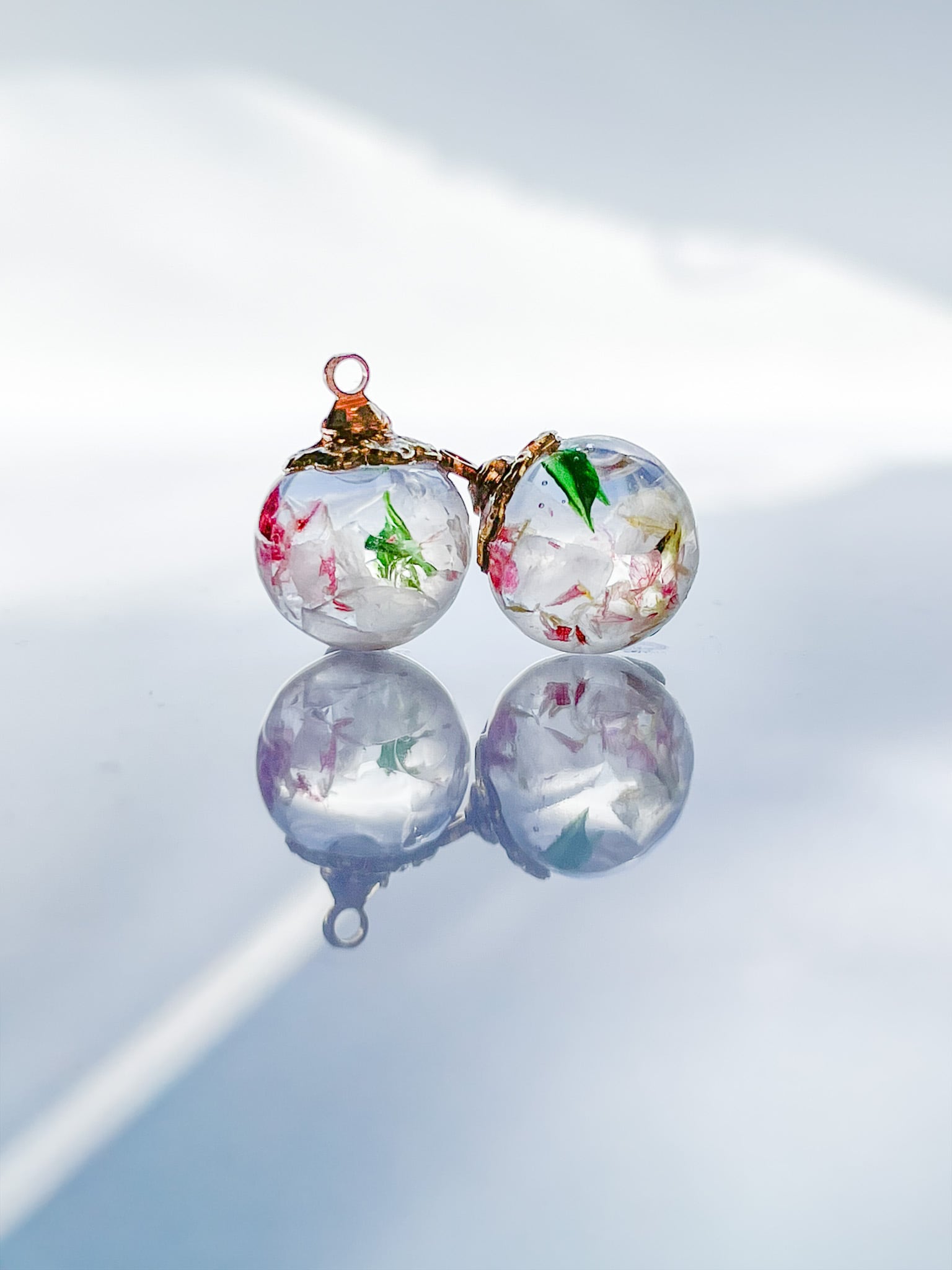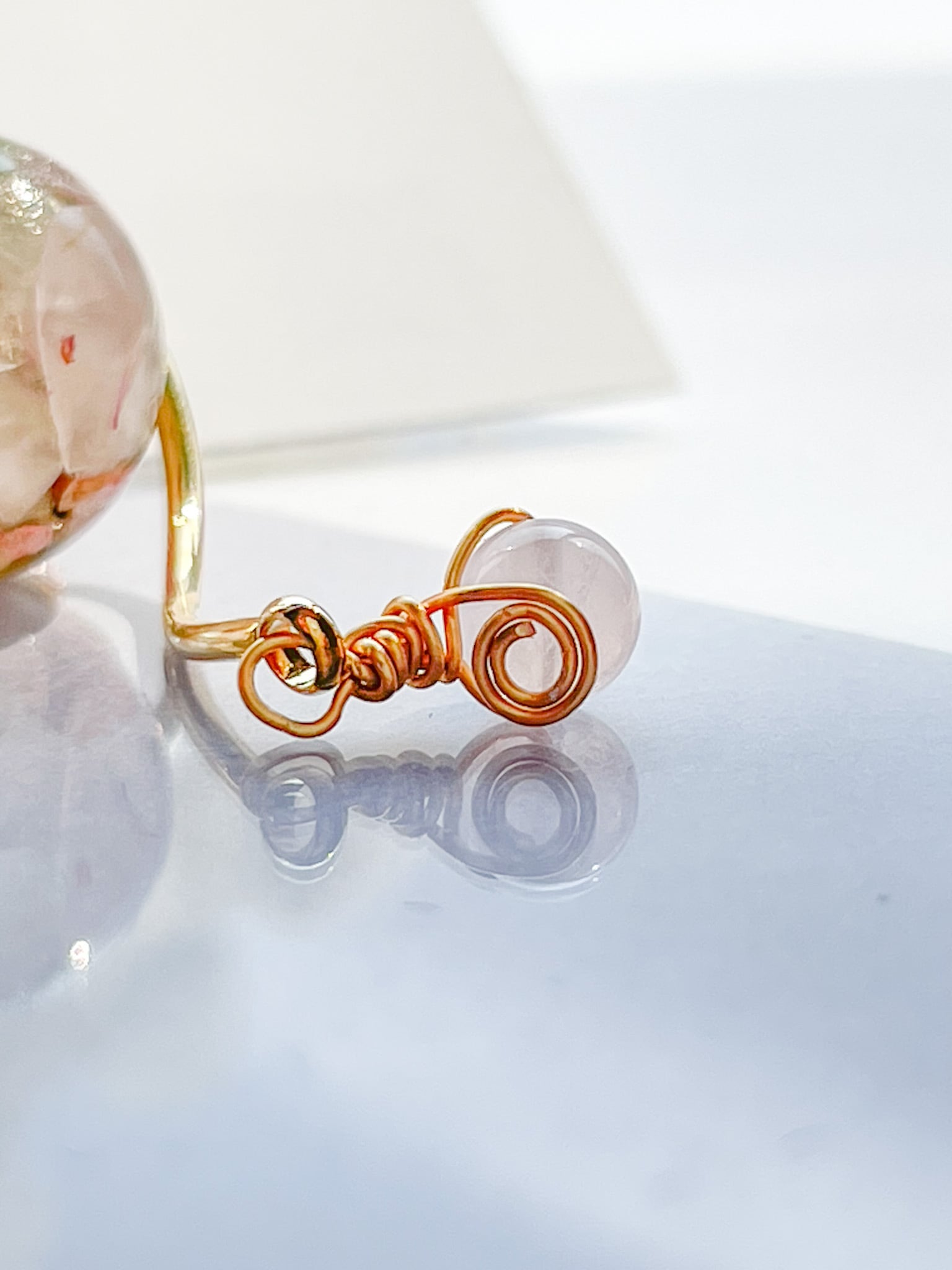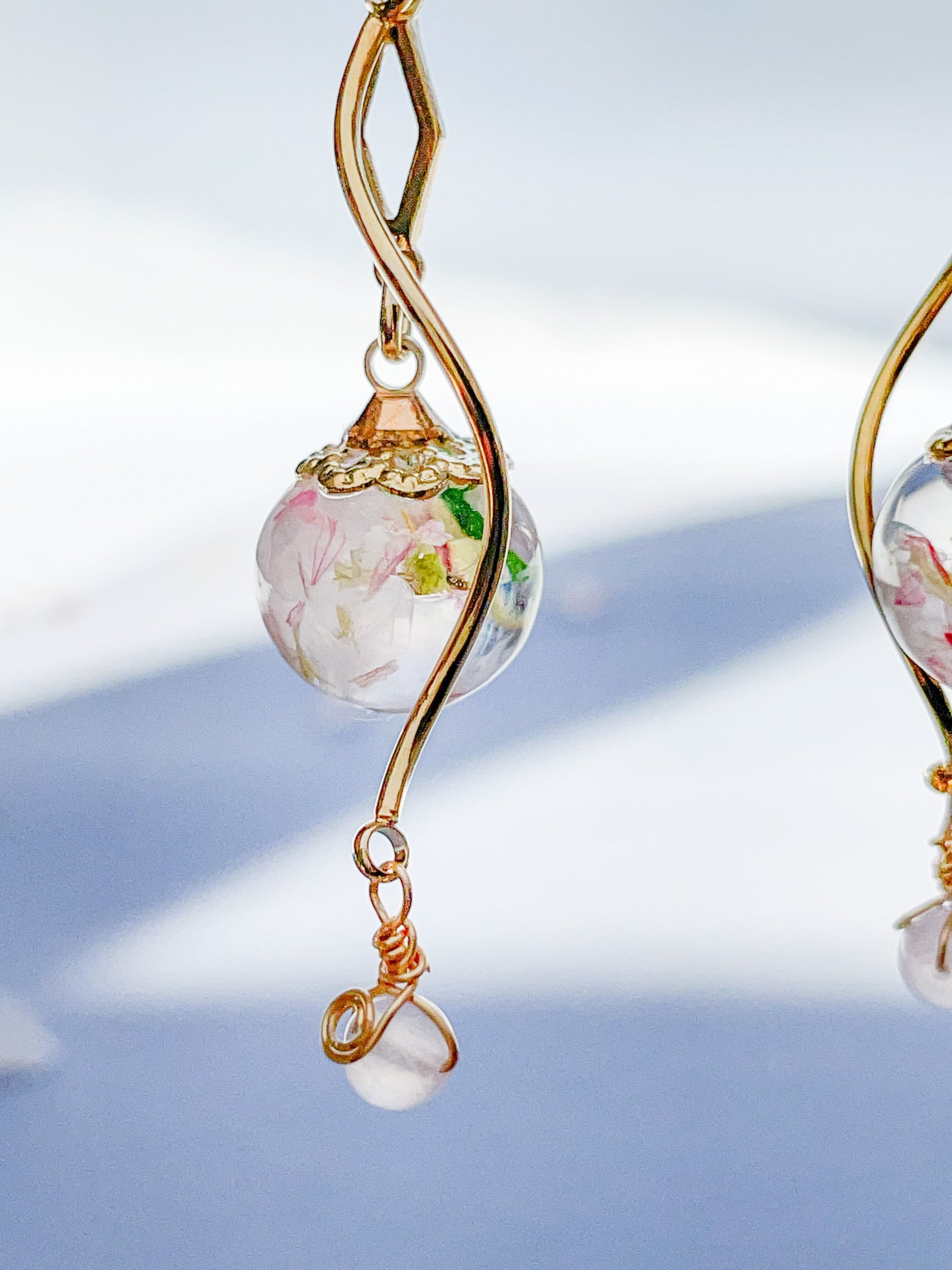 ローズクオーツと花びらのガラスドームピアス/イヤリング 揺れる ロング 軽い キラキラ ご褒美 ギフト金属アレルギー対応